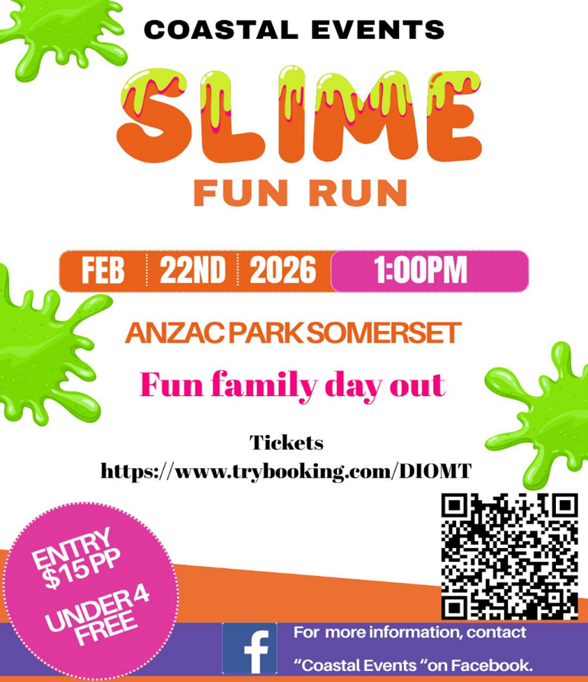 Taking place on Saturday 22nd February at 1:00pm, the Slime Run will be held at Anzac Park, Somerset, with the start location near the Surf Club carpark.