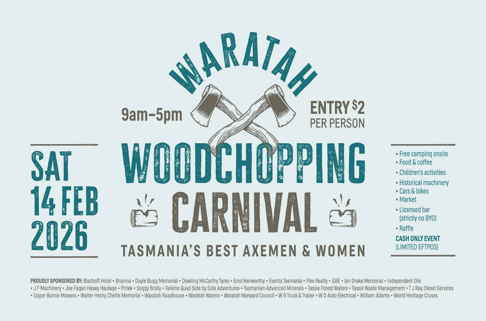 Join us for a great day out at the Waratah Woodchopping Carnival, featuring 18 exciting events, including the 400mm Tasmanian Standing Championship 🪓
