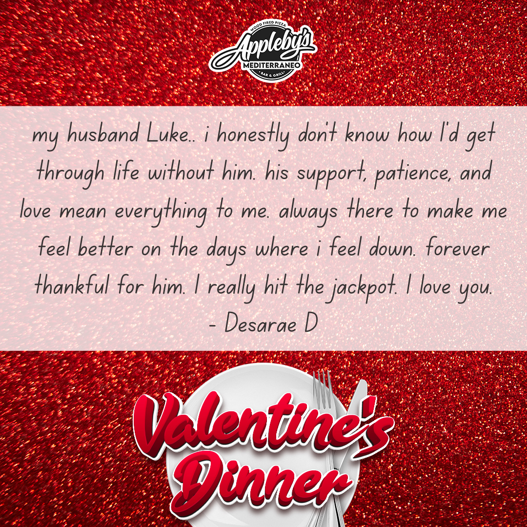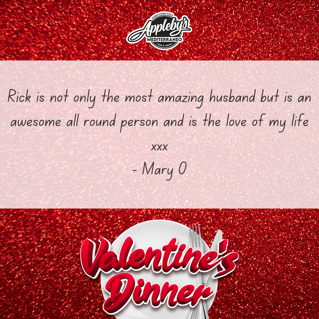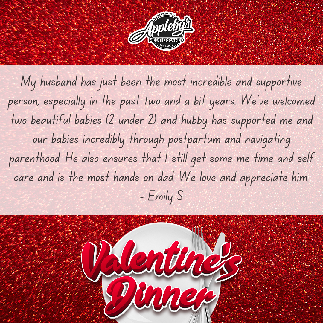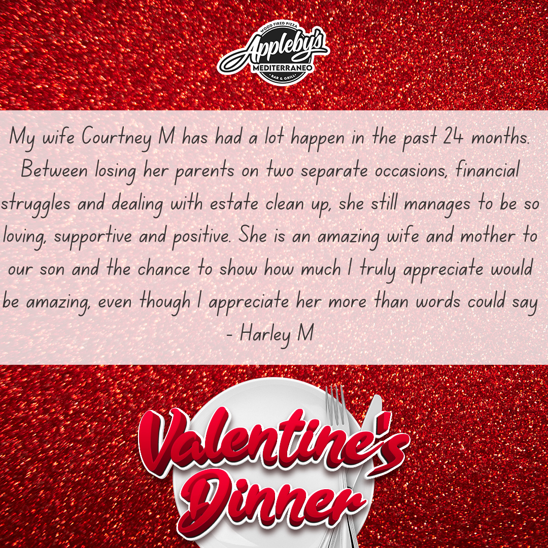 What You Could Win Selected entries will be shared right here, amplified on air for everyone to hear. Plus you could win an exclusive dining experience at Appleby’s Mediterraneo Bar and Grill, the perfect destination for life’s most meaningful celebrations.