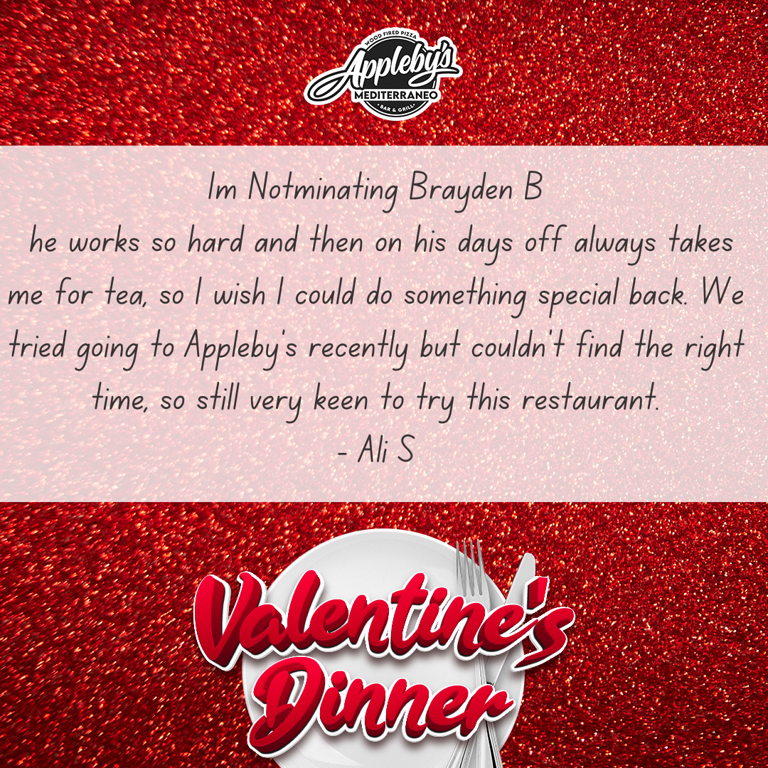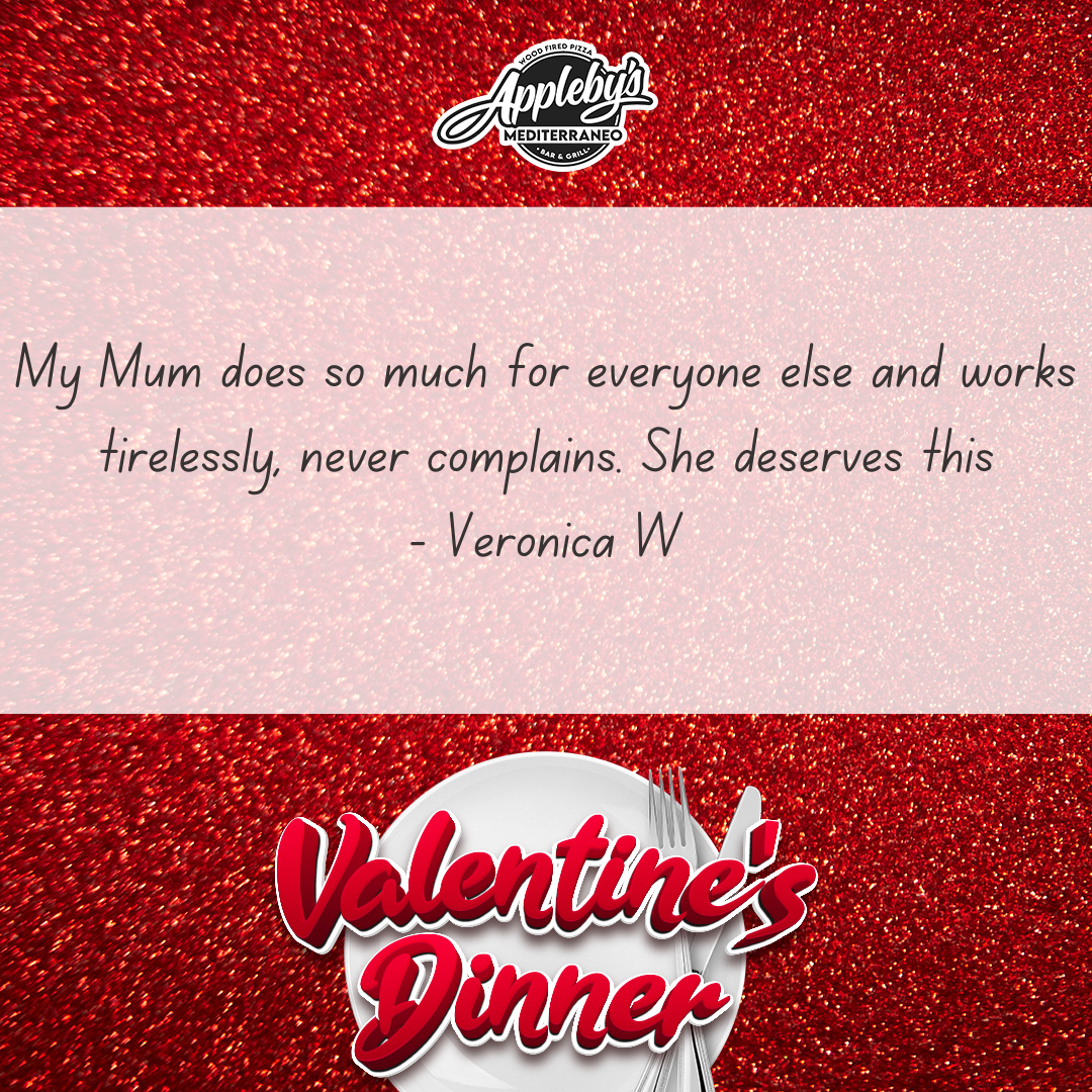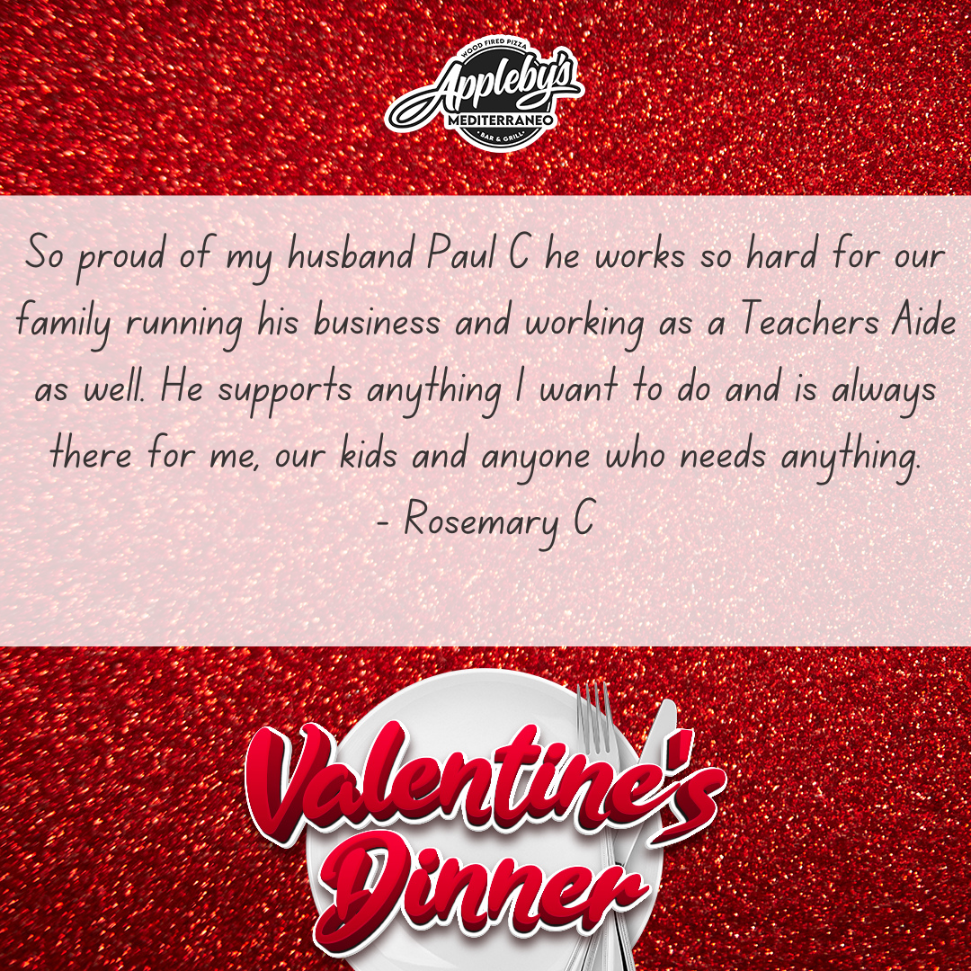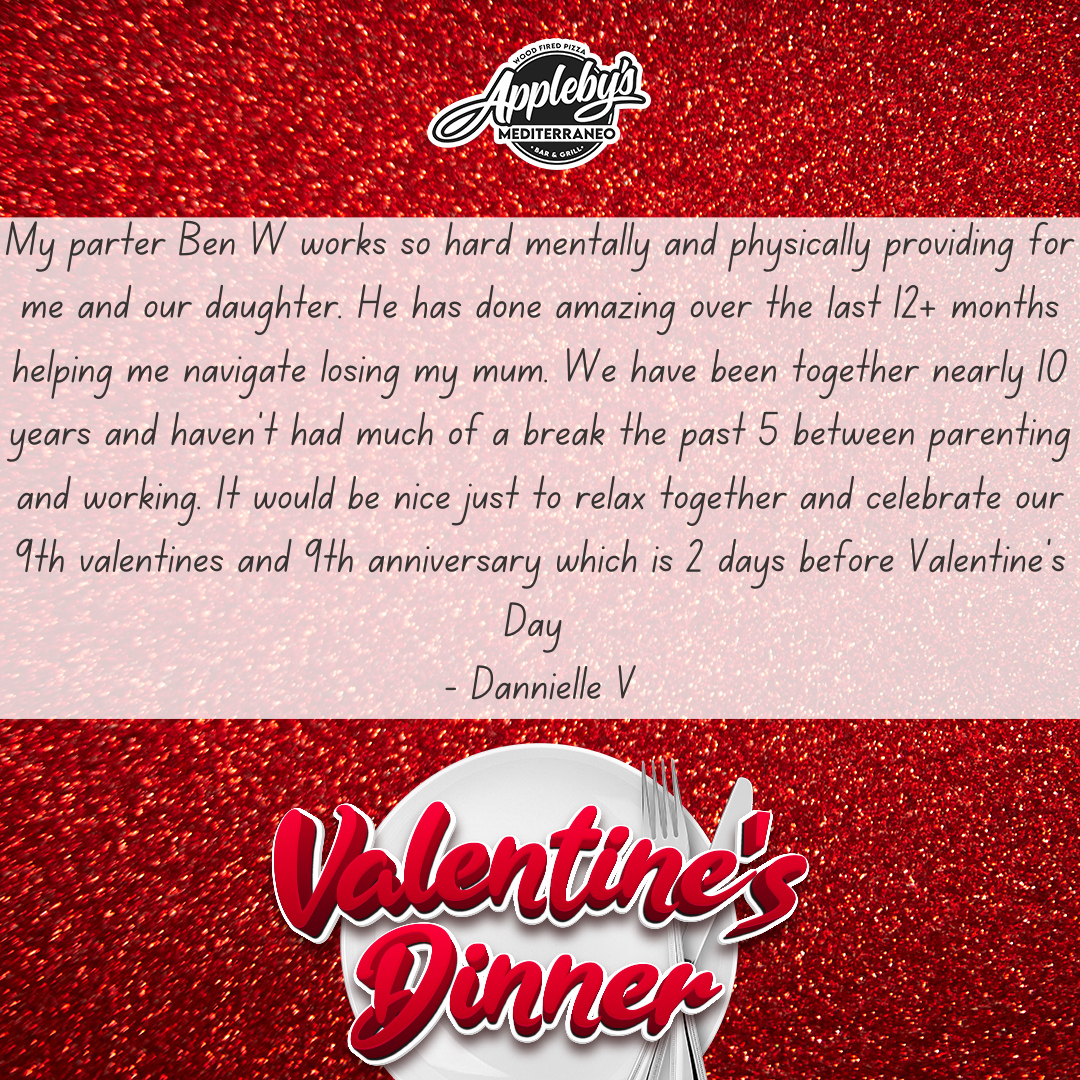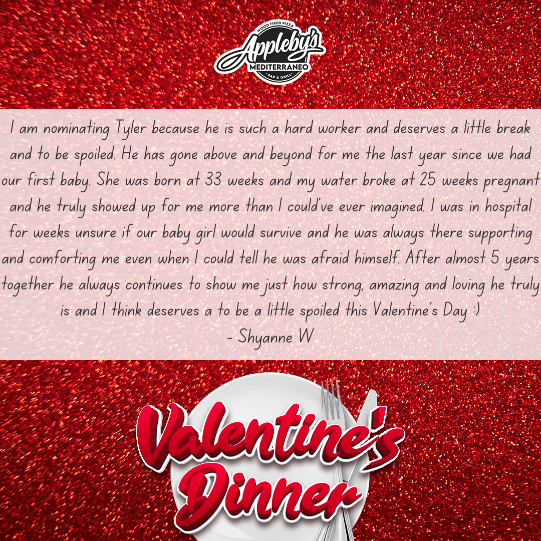 What You Could Win Selected entries will be shared right here, amplified on air for everyone to hear. Plus you could win an exclusive dining experience at Appleby’s Mediterraneo Bar and Grill, the perfect destination for life’s most meaningful celebrations.